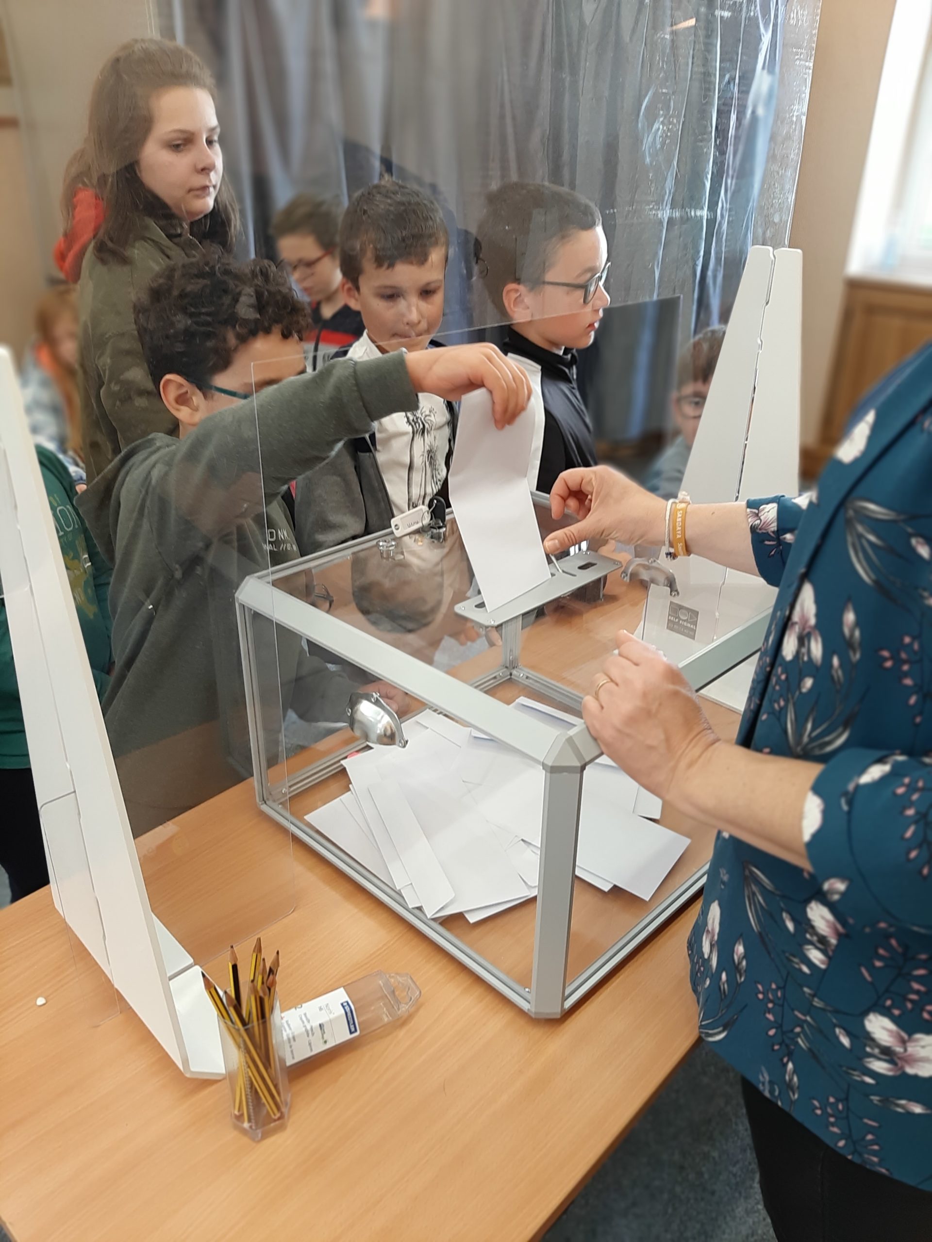 Munis de leur carte électorale, chaque enfant est venu se présenter pour recevoir son enveloppe, prendre ses cinq bulletins, rejoindre l’isoloir, glisser son enveloppe dans l’urne, signer la feuille d’émargement et enfin assister au dépouillement. Les cinq candidats avaient, auparavant, présenté leur programme avec 3 idées générales: une pour notre pays, une pour notre ville et une pour notre école.C’est ainsi que Maëlys Pécot a gagné cette élection avec 15 votes en sa faveur ! Très bon moment partagé tous ensemble. Merci à la mairie de nous avoir mis à disposition le bureau de vote.